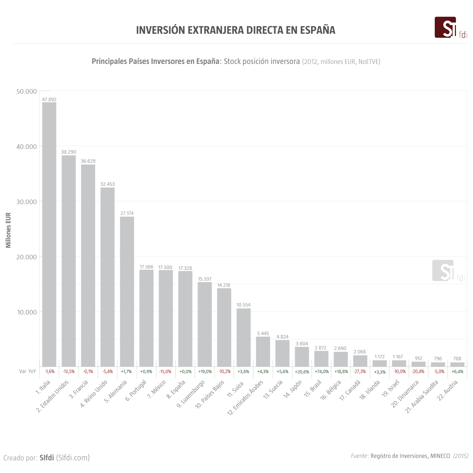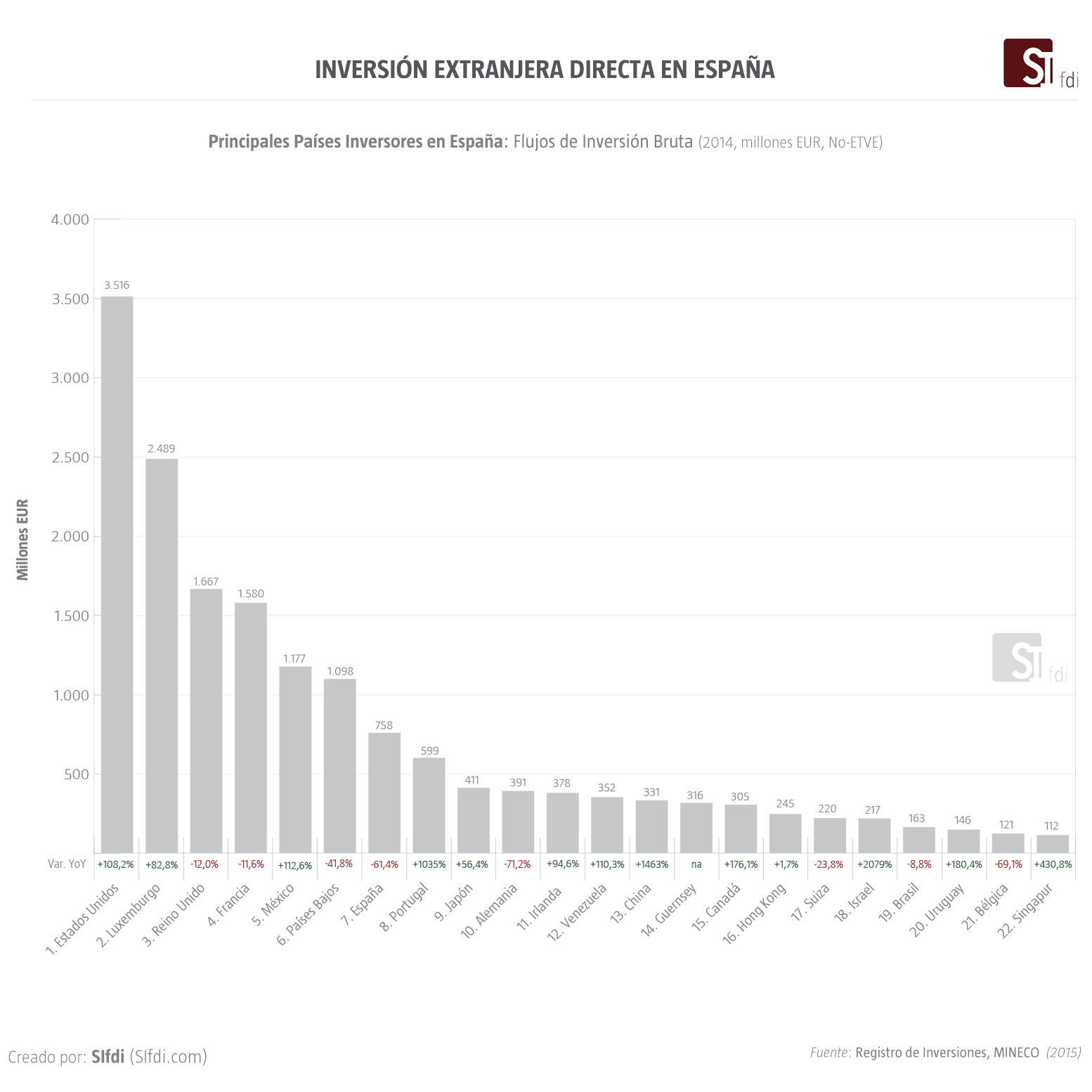 En las gráficas siguientes se puede apreciar de forma individual la aportación de los principales países inversores en 2014 y las variaciones interanuales de sus cifras, así como el stock de su posición inversora en 2012. Estados Unidos se ha vuelto a colocar como principal inversor individual en el país, seguido por Luxemburgo, Reino Unido, Francia y México, con comportamientos dispares. Se han experimentado descensos notables en las inversiones de algunas de las principales economías Europeas (Reino Unido, Francia, y especialmente en Alemania o Países Bajos), compensadas por los incrementos experimentados en Estados Unidos, Luxemburgo o algunos países latinoamericanos (México, Venezuela y Uruguay, fundamentalmente). No nos debe extrañar la presencia entre los principales inversores de economías como Luxemburgo, los Países Bajos y otras economías con atractivos esquemas para las inversiones de esta índole, que actúan como fuerte hub de inversiones en la región; No se ve todavía sin embargo demasiado impacto en el país de las operaciones desde otros centros similares de inversión como pueden ser Hong Kong o Singapur, con fuerte actividad en la región Asiática pero todavía reducida en nuestro país.