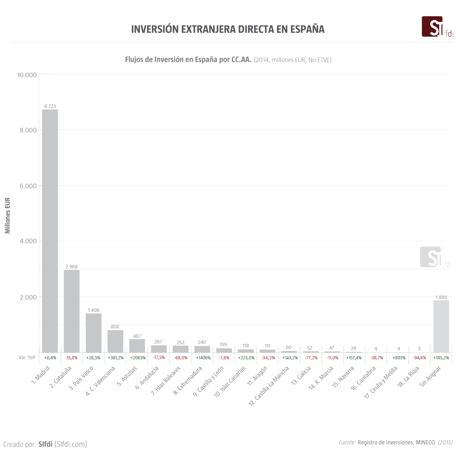 En 2014, la Comunidad de Madrid acumuló el 49,5% de la inversión productiva, manteniendo niveles similares al año precedente. Cataluña recibió el 16,8% de los flujos, con un moderado descenso sobre el año anterior, seguida a buena distancia por el País Vasco (8,0%) y la Comunidad Valenciana(4,6%), esta última con una subida muy significativa (+381,2). Destaca también el fuerte incremento registrado en Asturias, la quinta receptora del año, especialmente por la gran diferencia con su vecina Cantabria. Otras regiones con evoluciones positivas incluyen a Extremadura, las Islas Canarias, Castilla-La Mancha, Navarra o Ceuta y Melilla, si bien por las cifras de inversión que se manejan en ellas es difícil ver en ello una tendencia estable.